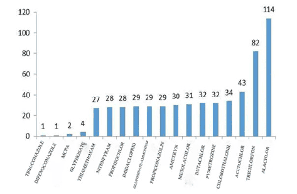 Một số quốc gia đã cấm sử dụng Tebuconazole và Difenoconazole, hai quốc gia đã cấm sử dụng MCPA. Có 4 quốc gia cấm sử dụng Glyphosate, Thiamethoxam, Nitenpyram và Propisochlor bị cấm ở 28 quốc gia, Imidacloprid, Glufosinate-ammonium và Propiconazol bị cấm ở 29 quốc gia và Ametryn, Metolachlor, Butachlor, Pymetrozine, Chlorothalonil và Acetochlor bị cấm ở 30,31 ,32,32,34 quốc gia tương ứng. Trichlorfon và Alachlor bị cấm ở 82 và 114 quốc gia. Cụ thể như sau:
