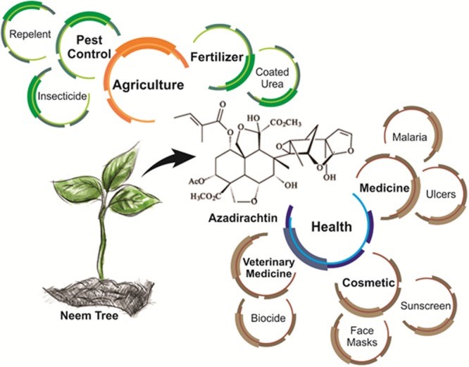 Trong nhiều thế kỷ, neem đã được sử dụng trong y học dân gian để điều trị các bệnh như sốt rét, loét, bệnh tim mạch và các vấn đề về da. Mặc dù có sự hạn chế trong các thử nghiệm lâm sàng để hỗ trợ cho yêu cầu điều trị, việc sử dụng neem đã mở rộng theo thời gian và nó là một thành phần quan trọng của y học Ayurvedic (kiến thức y học được phát triển ở Ấn Độ khoảng 7000 năm trước; Girish và Shankara Bhat, 2008; Ogbuewu et al., 2011). Ngoài các ứng dụng y tế của mình, neem còn gây hứng thú trong nhiều lĩnh vực khác (Hình 22). Trong lĩnh vực mỹ phẩm và vệ sinh, neem được sử dụng trong thành phần của mặt nạ, kem dưỡng da, kem chống nắng, xà phòng và kem đánh răng (Mathur và Kachhwaha, 2015). Các sản phẩm có nguồn gốc từ neem có thể đóng góp cho sự phát triển bền vững và giải quyết các vấn đề kiểm soát dịch hại trong nông nghiệp (Lokanadhan và cộng sự, 2012). Những sản phẩm này được hưởng lợi từ các đặc tính tự nhiên của neem như một chất điều hòa sinh trưởng côn trùng mạnh mẽ (IGR) cũng ảnh hưởng đến nhiều sinh vật khác (như tuyến trùng và nấm) và có thể hoạt động như một loại phân bón thực vật (Brahmachari, 2004).