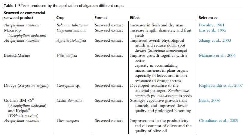 Các xét nghiệm miễn dịch đã cho phép xác định nhiều hợp chất có tác dụng kích thích sinh học (du Jardin, 2015). Phân bón lỏng rong biển đầu tiên được bán trên thị trường dưới tên Maxicrop vào năm 1949 và đến năm 1975, Booth đã cho rằng các tác dụng chiết xuất rong biển như cải thiện khả năng nảy mầm và chống stress. Rong biển có thể có nhiều tác dụng kích thích sinh học đối với cây trồng (Craigie, 2011; Battacharyya et al., 2015), bao gồm cải thiện sự nảy mầm (Sivritepe và Sivritepe, 2008), tăng trưởng (Basak, 2008), phát triển rễ (Crouch và Van Staden, 1991 ; Finnie và Van Staden, 1985), sự hấp thu chất dinh dưỡng (Castaings et al., 2011; Krouk et al., 2010; ; Luthje and Bottger, 1995), ra hoa (Basak, 2008), chất lượng và năng suất cây trồng (Povolny, 1981; Chouliara et al., 2009), và hàm lượng dinh dưỡng và đời sống cây trồng hữu ích (Kamel, 2014). Những ảnh hưởng này đặc biệt được đánh dấu đối với các cây trồng phát triển trong điều kiện dưới mức tối ưu (Craigie, 2011; Crouch và Van Staden, 1994).