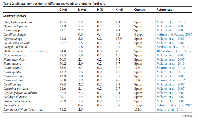 Hơn nữa, rong biển có chứa các yếu tố dinh dưỡng đa lượng và vi lượng (nitơ, phốt pho, kali, canxi, magiê, lưu huỳnh, clo, sắt, kẽm, đồng, molypden, mangan và boron) (Verkleij, 1992). Nó chứa một lượng lớn vitamin (Bourgougnon et al., 2011), chất kích thích sinh học và chất kháng khuẩn mà sau này có ích để chống lại một số loài gây hại và bệnh thực vật (Crouch et al., 1992).