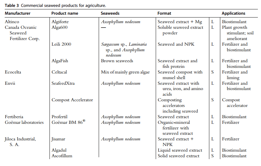 Từ giữa thế kỷ 20, phân bón từ rong biển đã được thay thế bởi nhiều loại chiết xuất đang ngày càng được sử dụng làm chất kích thích sinh học trong nông nghiệp hiện đại (Battacharyya et al., 2015; McHugh, 2003; Metting et al., 1990). Việc sử dụng chiết xuất ngày càng tăng có lẽ đã được thúc đẩy bởi sự dễ vận chuyển và lưu trữ của chúng, và do hoạt tính nhanh chóng của các hoạt chất của chiết xuất rong biển trên cây trồng (McHugh, 2003; Metting et al., 1990). Trên thực tế, chiết xuất rong biển cho đến nay đã được chấp nhận rộng rãi bởi ngành trồng trọt (McHugh, 2003); Ngoài ra, hầu hết các nghiên cứu về sử dụng nông nghiệp của rong biển đã tập trung vào cây trồng làm vườn.