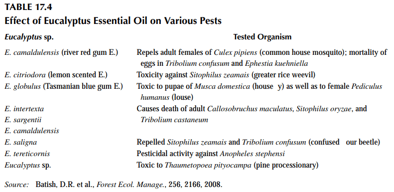 Tinh dầu khuynh diệp được lấy từ cây bạch đàn Úc. thuộc họ Myrtaceae. Nó đã được biết đến với tác dụng kháng khuẩn, kháng nấm và sát trùng trong hàng trăm năm (Batish et al., 2008). Độc tính của tinh dầu khuynh diệp đối với S. oryzae đã được báo cáo bởi Lee et al. (2001), và nó được sử dụng để xông nhằm kiểm soát loài vật gây hại này. Lee và cộng sự. (2004) đã báo cáo trong một nghiên cứu khác rằng một số loài Bạch đàn độc với S. oryzae: E. nicholii, E. codonocarpa và E. blakelyi, gây tử vong ở T. castaneum và R. dominica.