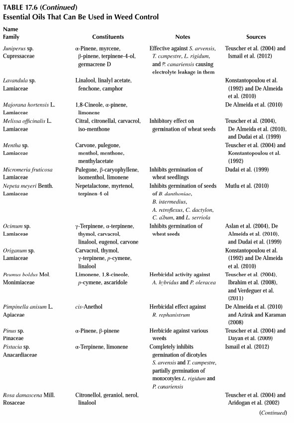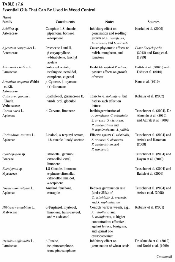 De Almeida et al. phát hiện các loại tinh dầu từ balm, caraway, bài hương thảo hyssop, xạ hương, cỏ roi ngựa vervain ức chế nảy mầm 100% cải Lepidium sativum (Brassicaceae). Củ cải Raphanus sativus (Brassicaceae) 100% không nảy mầm khi xử lý với tinh dâu cỏ roi ngựa vervain ở bất kỳ nồng độ. Ở nồng độ thấp, tinh dầu hồi và húng quế thúc đẩy quá trình nảy mầm và phát triển của hạt, trong khi tinh dầu caraway, sage, vervain và marjoram ức chế sự phát triển của củ cải. Xà lách Lactuca sativa’s (Asteraceae) không tăng trưởng khi xử lý tinh dầu xạ hương. Vervain, balm, và caraway cũng có khả năng hạn chế tăng trưởng xà lách. Nói chung ở một mức độ cao oxygenated monoterpenes có thể tác động gây chết đến cỏ dại.